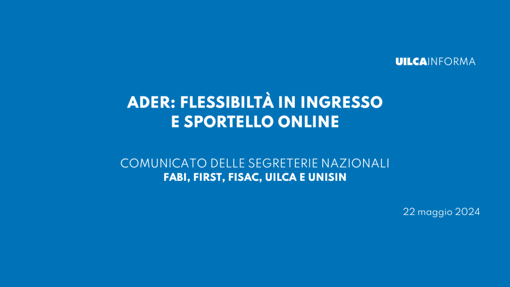 E’ proseguito in data odierna il confronto per la regolamentazione dello sportello on line, della flessibilità in ingresso e degli orari di sportello con sottoscrizione dei relativi accordi.