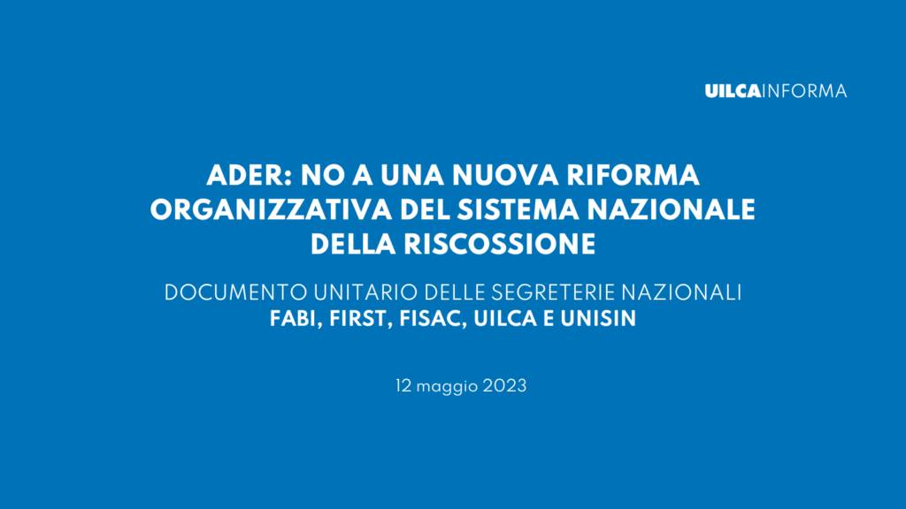 Le Organizzazioni Sindacali FABI, FIRST, FISAC, UILCA e UNISIN, in rappresentanza delle lavoratrici e dei lavoratori del Settore della riscossione dei tributi, ritengono opportuno esporre le proprie riflessioni e proposte nel merito della riforma del sistema di riscossione nazionale contenuta nel DDl di delega fiscale.