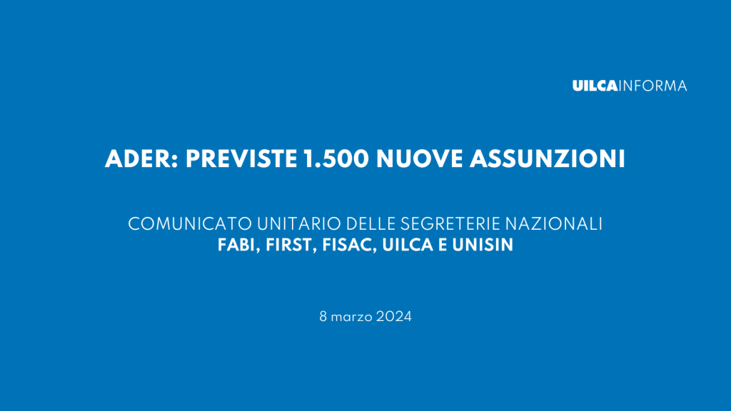 Tra gli argomenti trattati, di particolare rilevanza il numero dei colleghi usciti nel 2023, principalmente per pensionamento, che ammonta a 239 e conferma un andamento consolidatosi negli ultimi anni che ha determinato una forte carenza di personale in tutti gli uffici; carenza che queste Organizzazioni sindacali hanno più volte denunciato nelle Sedi aziendali ed istituzionali. L’Ente ci ha comunicato che, come anticipato lo scorso 5 febbraio nell’incontro sulla presentazione dei dati di ADE e di AdER dal Direttore Ruffini, si stanno definendo le procedure per 1500 nuove assunzioni. Entro il mese di maggio sarà con tutta probabilità pubblicato un avviso per il primo gruppo di 470 assunzioni di personale da occupare nelle direzioni regionali prima della fine dell’anno. Le assunzioni avverranno sulla base di una selezione nazionale effettuata dalla società FORMEZ P.A.