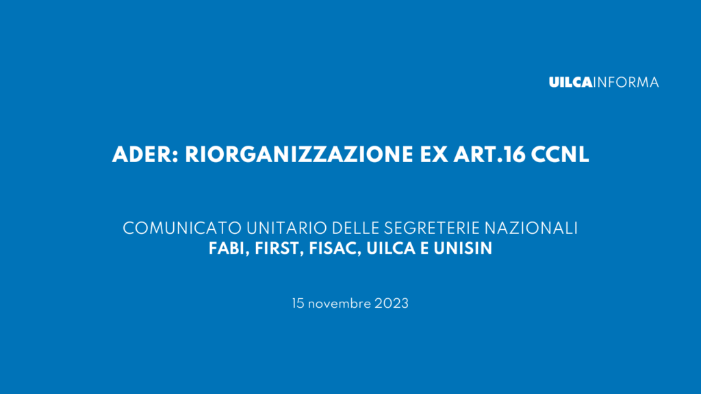 In data odierna le Scriventi Segreterie nazionali sono state convocate all’incontro per la procedura relativa alla ristrutturazione organizzativa dell’Ente che decorrerà dal 1 gennaio 2024. Il Rappresentante dell’Ente ci ha informato che, per dare seguito al percorso di avvicinamento del modello organizzativo di Ader a quello di Agenzia delle Entrate e alla prospettata cessione del ramo di azienda ICT a Sogei s.p.a., si è reso necessario rivedere l’attuale assetto organizzativo.