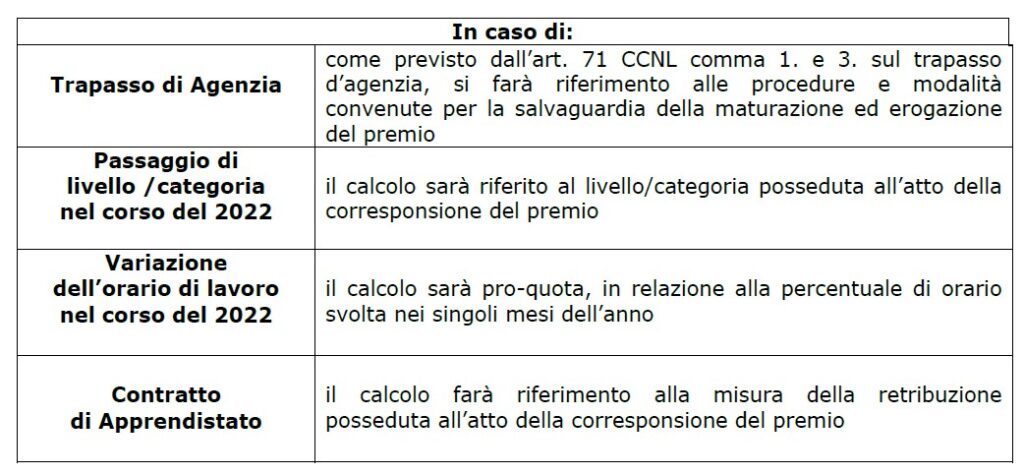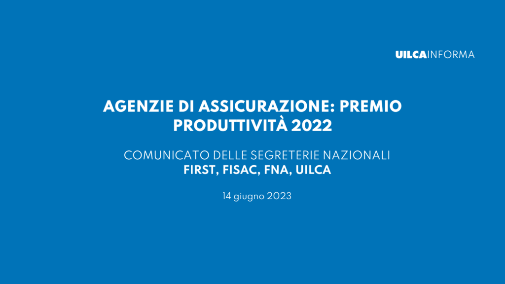 La corresponsione del Premio Aziendale di Produttività per l’anno 2022 conformemente al disposto dell’articolo 36 del C.C.N.L. 18/12/2017, deve essere effettuata per tutti i dipendenti nella busta paga del mese di giugno 2023. La condizione per il pagamento del Premio si verifica quando i valori di incremento delle provvigioni annue lorde percepite dall’agenzia nel 2022, rispetto all’anno 2021, comprensivo del tasso di inflazione reale 2022 (pari a + 11,6 %), siano pari o superiori, rispettivamente a: