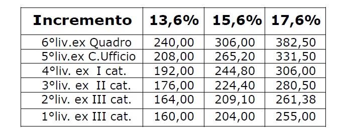 come indicato di seguito, nella specifica tabella contenente gli importi spettanti. L’incremento è identificato, oltre che dalle provvigioni annue lorde percepite – verificate per cassa – anche dai rappels e dagli altri sistemi premianti, comunque denominati, percepiti dagli agenti. Al verificarsi di una delle condizioni sopra indicate, verranno corrisposti, per ogni singola fascia, i seguenti importi indicati in tabella e determinati in misura fissa una tantum: