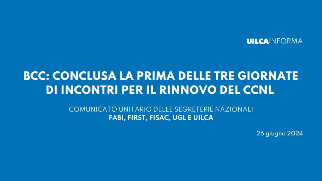 Si è conclusa la prima delle tre giornate di incontri dedicati al rinnovo del Contratto Collettivo Nazionale di Lavoro del Credito Cooperativo tenutasi, in presenza a Roma, tra le Segreterie Nazionali delle Organizzazioni Sindacali del settore e la Delegazione di Federcasse e dei Gruppi.