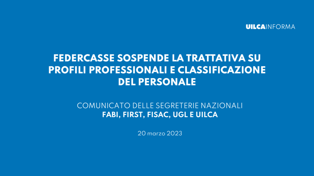 Un “bagno” di contemporaneità che come Organizzazioni Sindacali abbiamo sostenuto e rappresentato fin dall’inizio attraverso ragionamenti e documenti finalizzati a smuovere una discussione e ricercare concrete soluzioni con la controparte. Per tutta risposta dopo alcuni timidi e parziali passi in avanti compiuti da Federcasse, nonostante la dichiarata volontà politica di voler procedere su questi temi, la stessa Federcasse ha sospeso a tempo indeterminato il confronto.