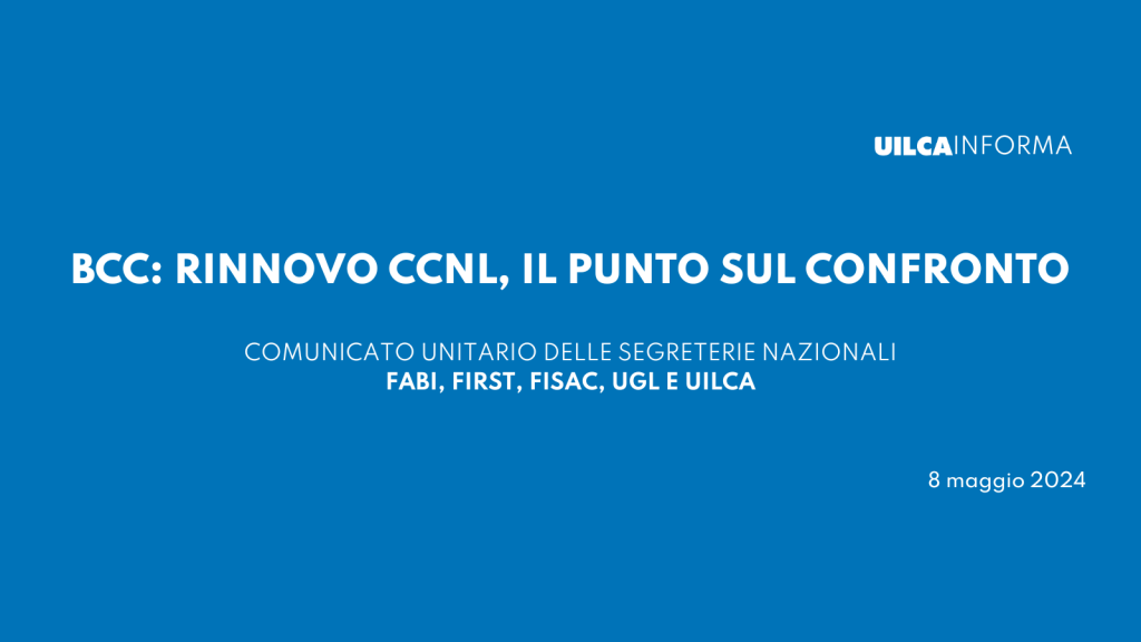 È proseguito in data di ieri, 7 maggio 2024, il confronto sul rinnovo del Contratto Collettivo Nazionale del Credito Cooperativo tra la Delegazione di Federcasse e le Segreterie Nazionali delle Organizzazioni Sindacali del settore.