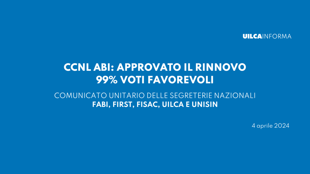 La consultazione sull’ipotesi di accordo per il rinnovo del Contratto Collettivo Nazionale di Lavoro del Credito si è conclusa con la sua approvazione. Una buona partecipazione al voto nella storia della categoria, favorita anche dalla campagna di informazione e consultazione molto capillare e con lo svolgimento di tantissime assemblee su tutto il territorio nazionale.