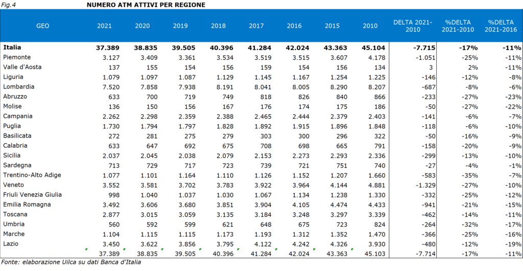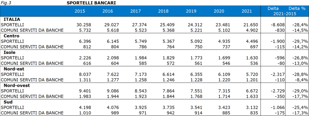 La riduzione degli sportelli bancari del 28,5% e dei comuni con almeno uno sportello bancario (-14,5%), dal 2015 al 2021, ha coinciso con la diminuzione, nello stesso periodo, dell’11% della presenza degli Atm sul territorio (Figg.3 e 4).