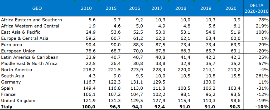 A livello mondiale si può osservare come nelle aree più industrializzate del mondo o con un maggior benessere economico, quali l’Europa e il Nord America, la riduzione degli Atm nell’ultimo decennio è un fatto strutturale, in linea con la stessa tendenza in Italia; mentre in continenti quali Africa, Asia e America Latina si osserva una crescita degli Atm, seppure con valori non significativi (Fig.5).