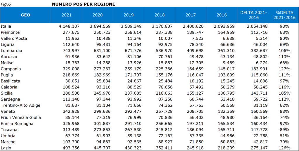 Non crediamo che l’evoluzione dei sistemi di pagamento in Africa, Asia e America Latina passi per l’installazione di nuovi Atm: spesso lo sviluppo economico non ripercorre modelli di crescita già visti, ma utilizza l’ultima tecnologia disponibile, per cui il prossimo passo sarà dal contante direttamente alle app”, osserva Roberto Telatin, responsabile del Centro Studi Uilca Orietta Guerra. “Per l’Italia è interessante osservare come negli ultimi cinque anni il numero di Pos sia aumentato del 98%: questo fenomeno è diffuso in tutte le regioni, seppure con incrementi differenziati, evidenziando come anche grazie a scelte politiche la domanda di utilizzo della moneta elettronica cresca” (Fig.6).
