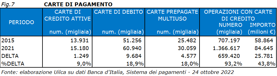L’impegno della Bce nello sviluppo dell’euro digitale, quale risposta al diffondersi delle criptovalute, conferma che per il prossimo futuro i mezzi di pagamento e di trasferimento del denaro saranno molto condizionati dalla tecnologia, che ha reso le transazioni più semplici e sicure. Le innovazioni tecnologiche, quando supportate da corrette politiche commerciali, hanno la forza di ridisegnare le abitudini economiche delle imprese e dei consumatori. I sistemi di pagamento ne sono un esempio, come si evince dall’utilizzo delle carte di credito, il cui numero di operazioni negli ultimi sei anni è aumentato del 93,2%, per un maggiore valore delle transazioni (+43,8%) (Fig.7).