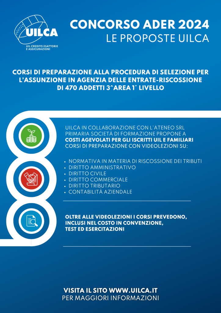 La Uilca, in coerenza con la propria linea politico-sindacale, ha deciso di offrire agli iscritti della Uil e ai loro familiari la possibilità di avvalersi e ricorrere ad un percorso formativo per la preparazione alla prova d’esame prevista per la suddetta selezione. Nell’intento di offrire il miglior ausilio possibile ha stipulato una convenzione con L’Ateneo Srl, primaria società di formazione con consolidata esperienza, che garantisce non solo corsi specifici sulle materie previste dal bando di selezione, ma un supporto costante durante l’intero percorso di preparazione. Nei corsi proposti da L’Ateneo, in convenzione con Uilca, i concorrenti potranno trovare video lezioni, slides, testi, quiz ed esercitazioni.