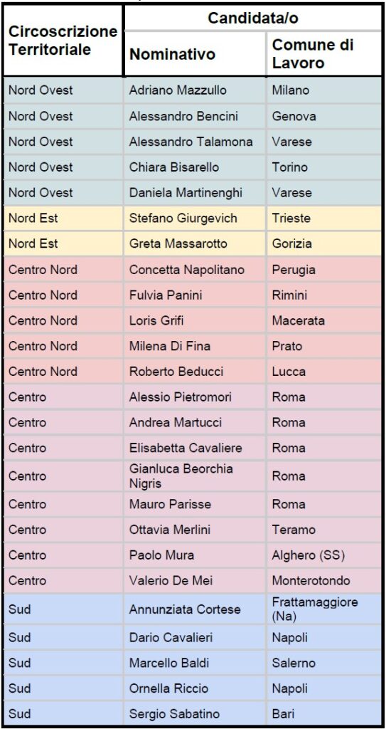 La lista delle candidate e dei candidati, divisa per Circoscrizione, è quella sotto: