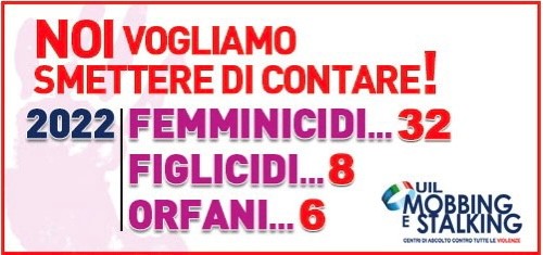 Il numero dei femminicidi sale già a 32 nel primo quadrimestre del 2022, 10 nel solo mese di aprile. Noi vogliamo smettere di contare! Uilca con Uil Mobbing e Stalking contro ogni forma di violenza.