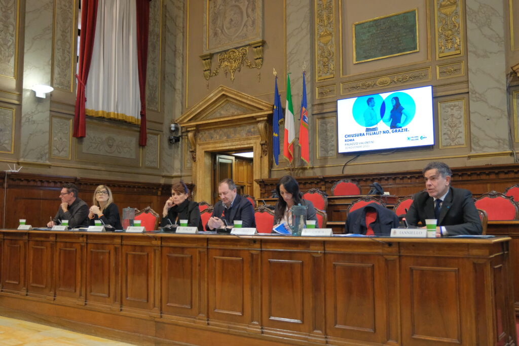 “È il momento di chiusura della nostra campagna Chiusura filiali? No, grazie, un grande impegno che ci ha visto coinvolti per tutto l’anno sul territorio nazionale. È un piacere essere qui presso la sede della Città metropolitana di Roma Capitale”, così il segretario generale Uilca Fulvio Furlan oggi nell’Aula Consiliare Giorgio Fregosi di Palazzo Valentini saluta e ringrazia la presidente dell’Assemblea Capitolina Svetlana Celli, la consigliera delegata alla viabilità, mobilità e infrastrutture di Città metropolitana di Roma Capitale Manuela Chioccia, la delegata del Direttivo Anci Lazio Marina Battisti, il segretario generale Uil Lazio Alberto Civica e il segretario generale Uilca Lazio Sergio Ianniello. “La loro presenza è importante perché è necessario aprire un dibattito allargato sul problema della desertificazione bancaria: se è vero che le banche sono un soggetto economico, è altrettanto vero che sono un soggetto sociale. Abbiamo ampiamente dimostrato, non ultimo durante i momenti più critici dovuti al Covid-19, di svolgere un servizio sociale essenziale. Quando il presidio fisico della banca viene meno, l’impatto ricade sull’intero territorio e sulla comunità, a partire dai soggetti più deboli, i primi che noi, come Sindacato, abbiamo il dovere di tutelare”, commenta Furlan.