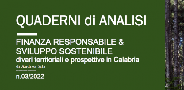 Questo nuovo numero dei Quaderni di analisi è dedicato alla finanza responsabile e lo sviluppo sostenibile: divari territoriali e prospettive in Calabria.