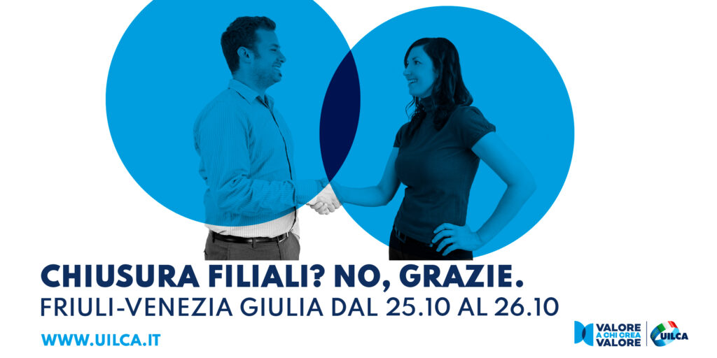 L’appuntamento in piazza per dire Chiusura filiali? No, grazie con Uilca è per mercoledì 25 ottobre a Villa Santina (UD), dalle 10:30 alle 12:30, presso il Parco centro sociale. La tappa poi prosegue giovedì 26 ottobre a Trieste, in via San Francesco d’Assisi, 5 dalle 10:30 alle 12:30 con la partecipazione del segretario generale Uilca Fulvio Furlan, del presidente della Regione Friuli-Venezia Giulia Massimiliano Fedriga e del segretario generale Uil Friuli-Venezia Giulia Matteo Zorn.