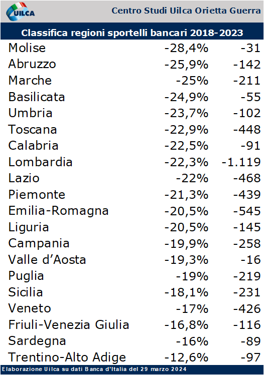 Dal 2018 al 2023, gli sportelli bancari sono diminuiti del 17% (-426), passando da 2.499 a 2.073. I comuni serviti da banche sono diminuiti del 7,8% (-39), passando da 499 a 460. Nel 2023, sono 169.187 gli abitanti senza sportello bancario, pari al 3,5%, di questi 53.437 sono over 60.