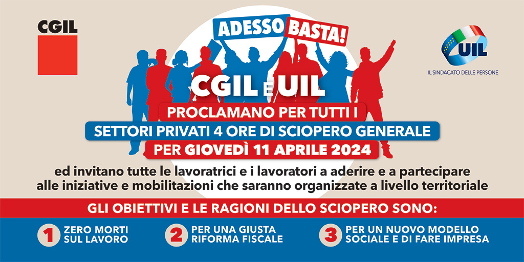 Uil e Cgil proclamano, per tutti i settori privati, 4 ore di sciopero generale per giovedì 11 aprile 2024.