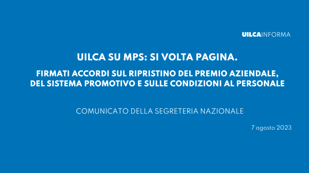 “Finalmente dopo anni di straordinario impegno e sacrificio, le lavoratrici e i lavoratori di Mps vedono ripartita la contrattazione di secondo livello che, tra le altre cose, porta a un riconoscimento economico e alla definizione di percorsi professionali – dichiara la segretaria nazionale Uilca Mariangela Verga – Questo risultato segna una svolta nella storia del Gruppo che può finalmente guardare al futuro con grande fiducia. La Uilca ha da sempre creduto nella necessità di voltare pagina e dare risposte concrete a chi ha negli anni lavorato per il risanamento del Gruppo. Adesso che il Monte dei Paschi è una banca in salute ci aspettiamo possa cogliere le migliori opportunità per il suo futuro”.
