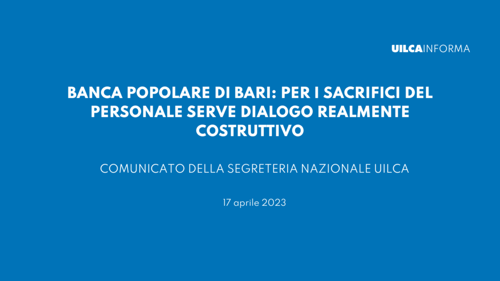 Uilca auspica l’avvio di un dialogo realmente costruttivo con la Banca e si rende da subito disponibile ad aprire un tavolo di confronto, se necessario anche permanente, al fine di esaminare tutte le possibili soluzioni per offrire condizioni lavorative in grado di valorizzare i dipendenti della Popolare di Bari e l’impegno con cui ne sostengono ogni giorno l’attività, per garantirne un futuro di sviluppo.
