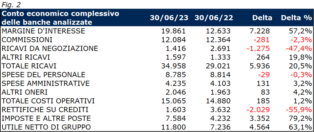 Secondo l’analisi del Centro Studi Uilca Orietta Guerra il sistema bancario italiano conferma, nel primo semestre del 2023 rispetto allo stesso periodo del 2022, un marcato aumento di utili e ricavi. L’utile contabile cresce complessivamente del 62,5% e si attesta a 11,5 miliardi di euro (4,4 miliardi in più rispetto al primo semestre del 2022 che conteneva il badwill negativo di circa 1 miliardo su Bper per l’acquisto di Carige) (Fig.1). I ricavi registrano un aumento del 20,5%, con il margine d’interesse che sale del 57,2% e le commissioni che diminuiscono del 2,3%. I costi operativi aumentano dell’1,2% (Fig. 2). A fare da traino, ancora una volta, l’ampliamento dello spread fra tassi attivi sugli impieghi in crescita e i tassi passivi, che remunerano conti correnti della clientela sostanzialmente stabili.