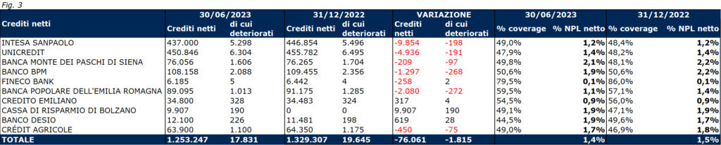 Pur in questo scenario dovrebbe persistere l’andamento positivo del settore bancario, considerando anche che gli Npl delle banche analizzate, come confermato dalla diminuzione del 55,9% delle rettifiche sui crediti (nel 2022 erano incluse le svalutazioni degli asset russi e ucraini) (Fig.2), sono sotto controllo e hanno una ridotta incidenza rispetto ai crediti totali erogati, con un Npe ratio netto dell’1,4%, e in riduzione rispetto al dicembre 2022 (1,5%). Bisogna evitare che sia il credit crunch a mantenere bassi gli Npl nei bilanci delle banche; diversamente a soffrirne sarebbe l’economia nazionale nel suo complesso (Fig.3).