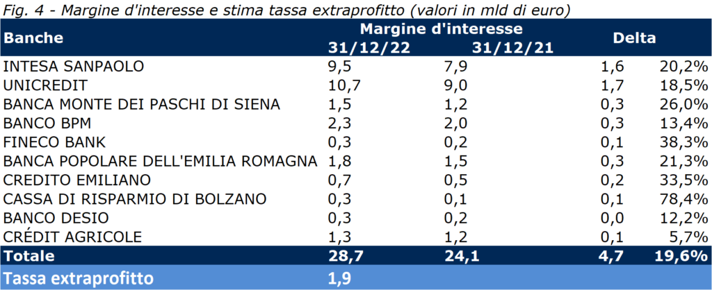 Il Centro Studi Uilca Orietta Guerra ha elaborato una prima valutazione degli impatti della decisione del Governo sulle principali banche (Fig. 4): la tassa sugli extra profitti comporterebbe per lo Stato un primo introito, per il 2022, di circa 2 miliardi di euro e un altro stimabile in oltre il doppio per il 2023. In merito va evidenziato che l’imposta introdotta non si applica sugli utili di bilancio, ma sul margine d’interesse. L’imposta si applica quando la voce margine d’interesse nel 2022 eccede del 3% quello del 2021 e quando il margine d’interesse del 2023 eccede del 6% quello del 2022, parametri sicuramente superati dalle banche italiane. Sulla differenza del margine d’interesse fra i due periodi si applica la tassazione del 40%, che comunque non deve essere superiore al 25% del patrimonio netto alla chiusura dell’esercizio.